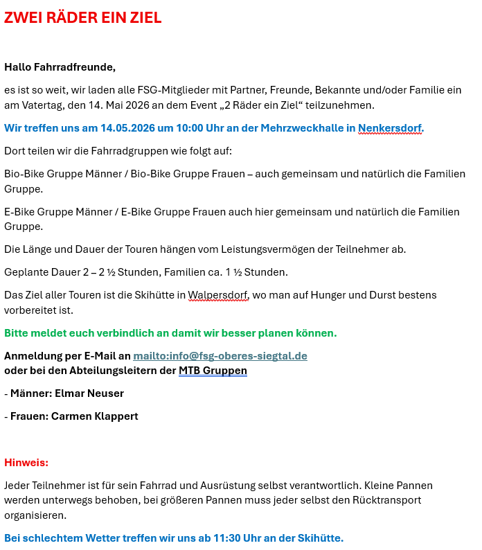 Herzlich Willkommen beim FSG Oberes Siegtal e.V. Netphen Netphen, DE 11:39, Apr. 27, 2026 15°C Bedeckt Humidity: 40 % Pressure: 1022 hPa Wind: 2 Km/h Wind Gust: 6 Km/h Clouds: 98% Visibility: 10 km Sunrise: 05:08 Sunset: 19:41